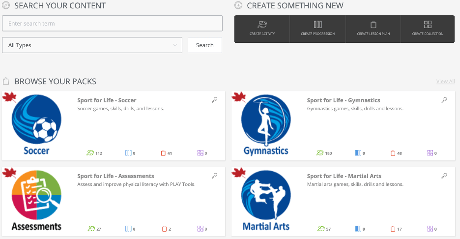 For the foreseeable future, people will continue to be encouraged to stay at home. This necessitates access to at-home sport programs and activities. You can create your own activities, lesson plans, progressions and collections. Once you have established the appropriate physical literacy programming, aligned with the standards of your region, the next step is to create packs for distribution. These ‘Global Packs‘ are essentially your branded and packaged content that you can either distribute internally to colleagues, or externally to generate revenue. Take a look at some of the packs Sport for Life has created, which are displayed on our dashboard…